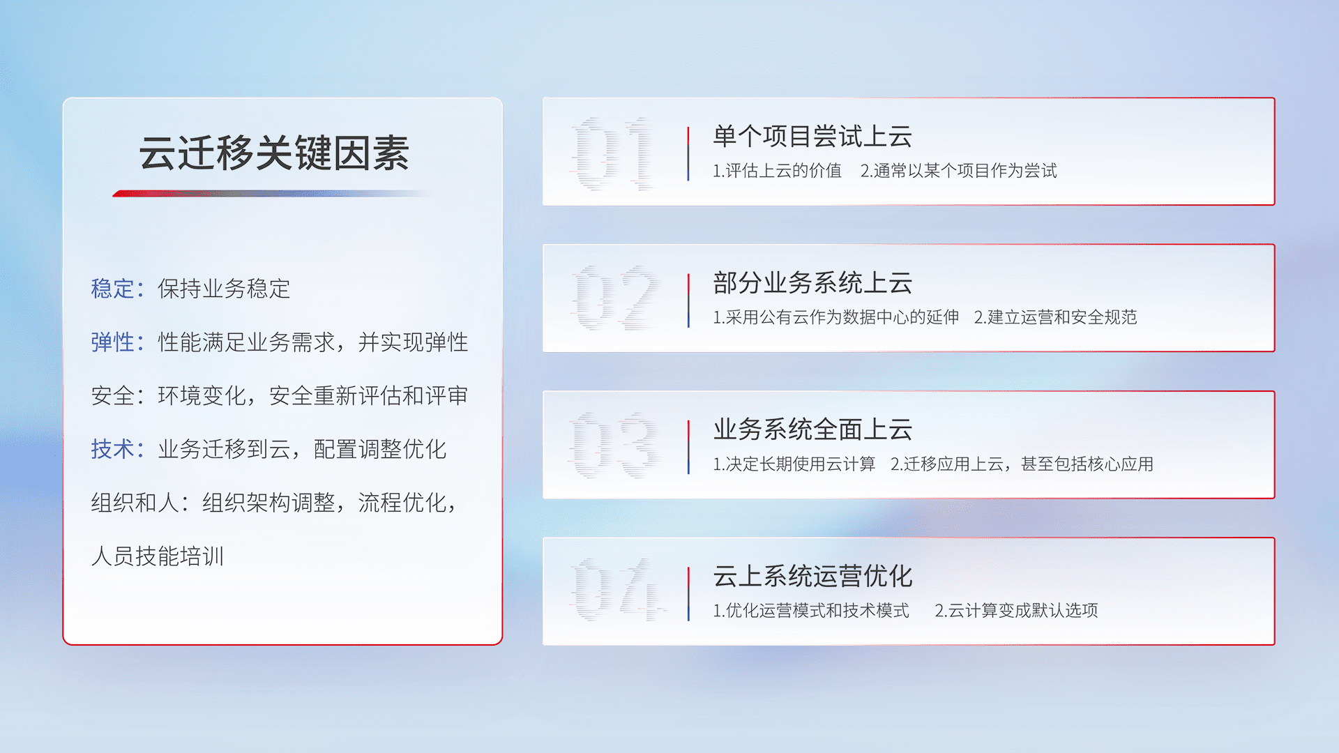 结合实际业务,,从规划设计、、、、云平台选型、、云原生改造、、、、数据迁移、、集成交付,,,,迁移全过程为客户识别最佳上云路径,,,,做好风险识别管理,,,设计网络架构、、、身份权限、、、安全审计合规、、操作审计、、日志审计、、、、监控告警策略、、多站点容灾设计等,,,对云上基础设施进行整体规划,,,提升IT治理水平,,,以满足弹性、、高可用、、、、高性能的需求。。。