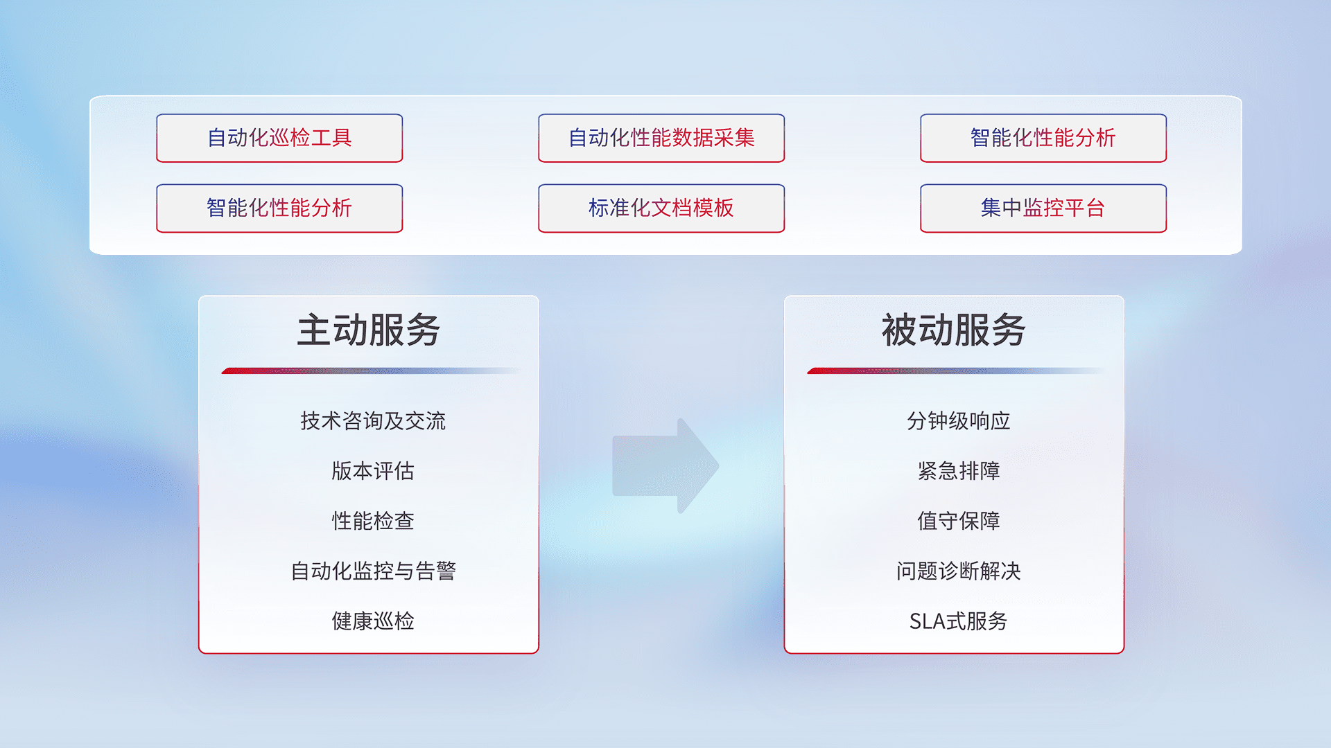 智能化工具和标准化文档,,,,保障服务质量,,提供主动服务(包含技术咨询、、版本评估、、、、性能检查、、、自动化监控与告警、、健康巡检)和被动服务包含(分钟级响应、、紧急排障、、值守保障、、、、问题诊断解决、、、SLA服务)。。。。